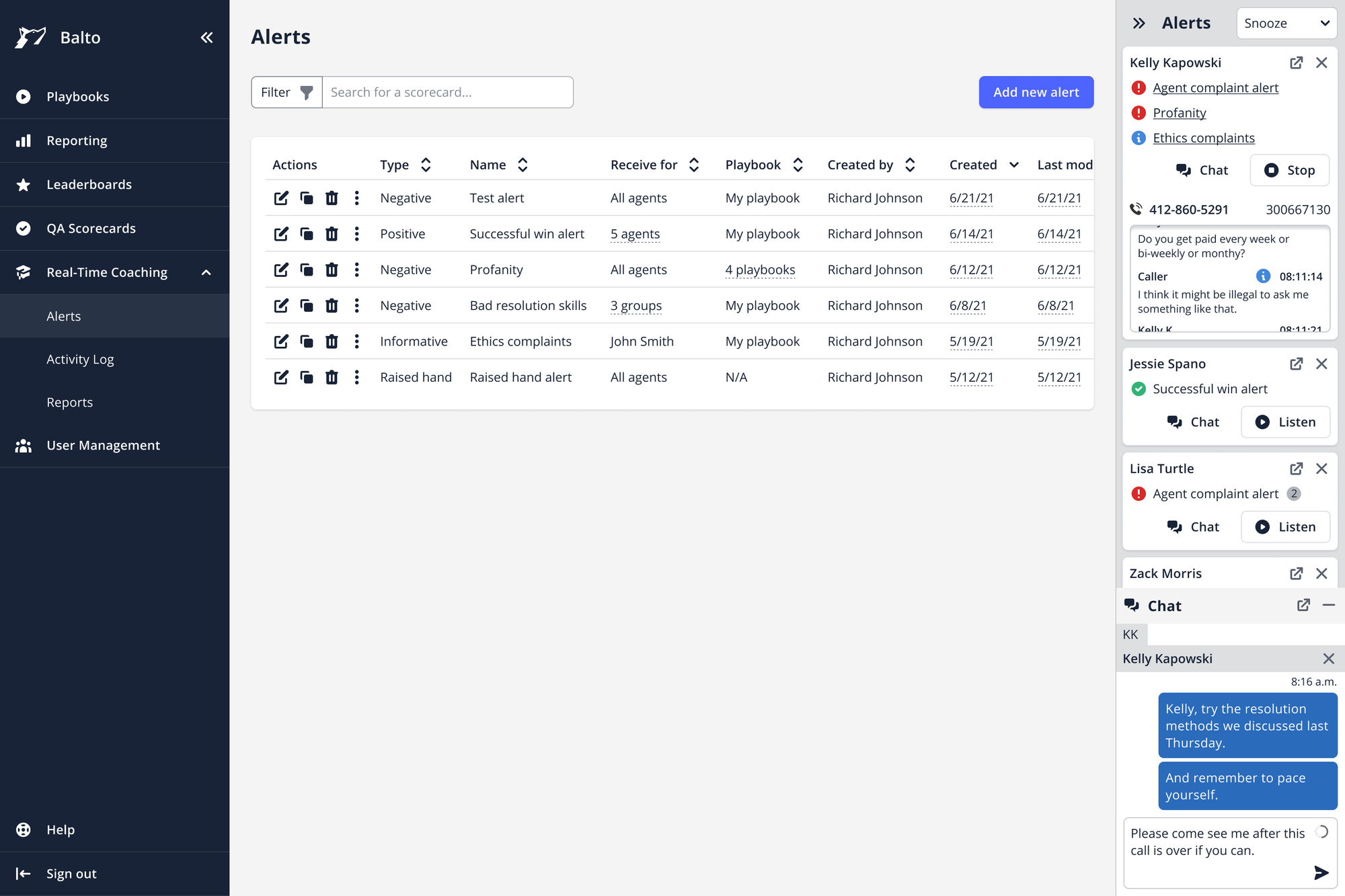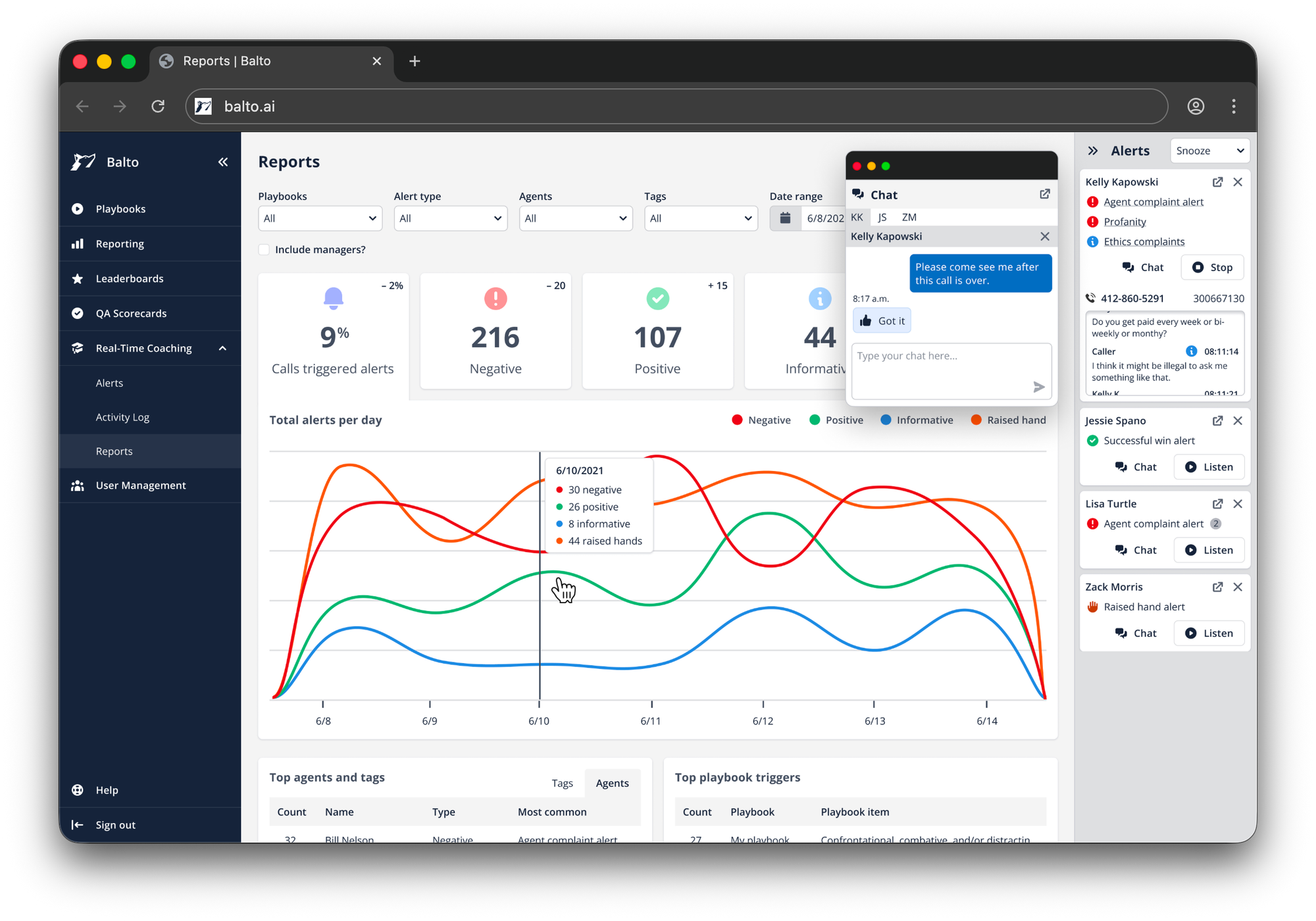Building on Balto’s machine learning foundation, I conceived and validated multiple user flows that resulted in a new product offering, Real-Time Coaching. The module introduced a native chat experience and an array of data-visualization tools, giving managers an at-a-glance view of team activity and productivity.