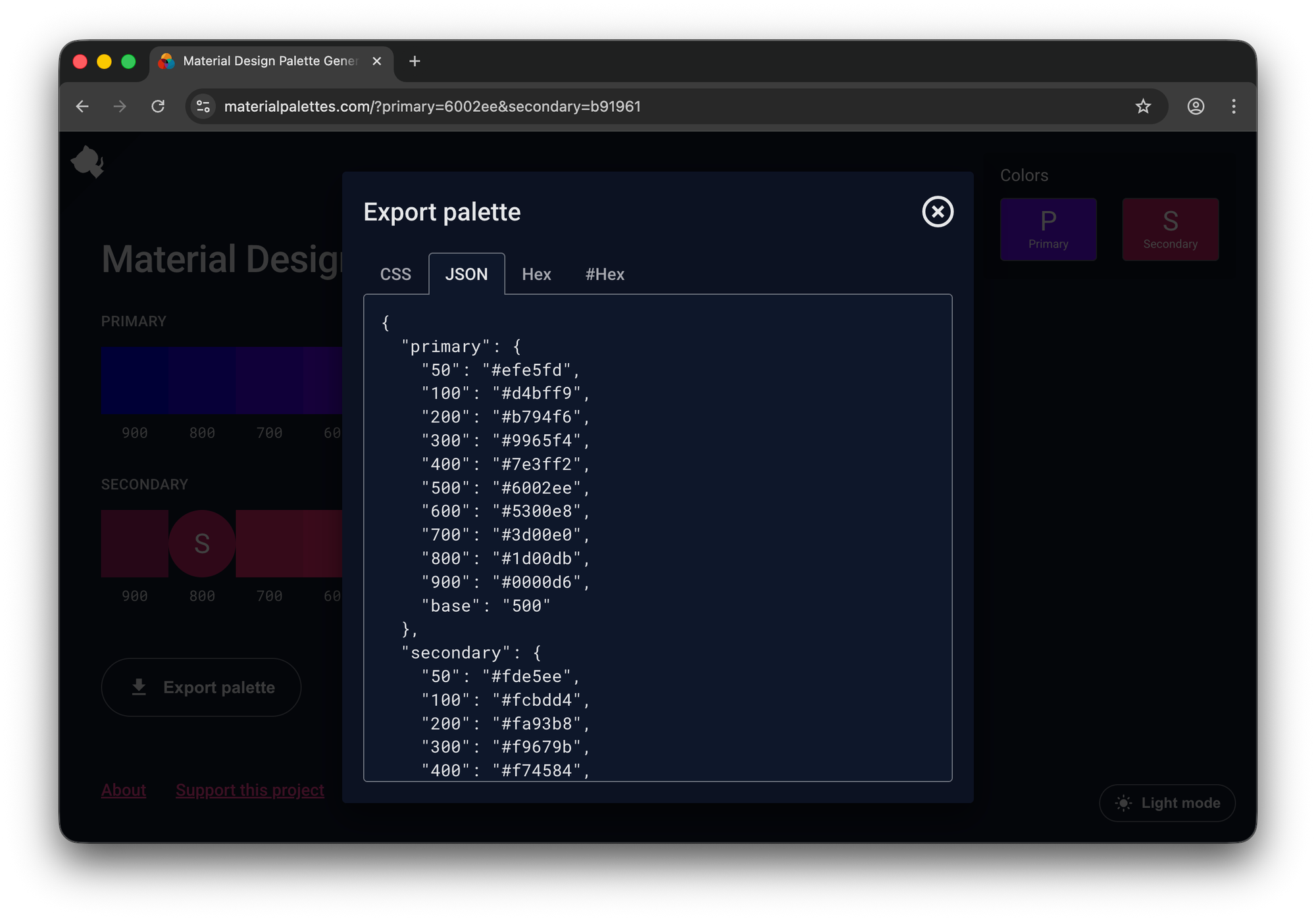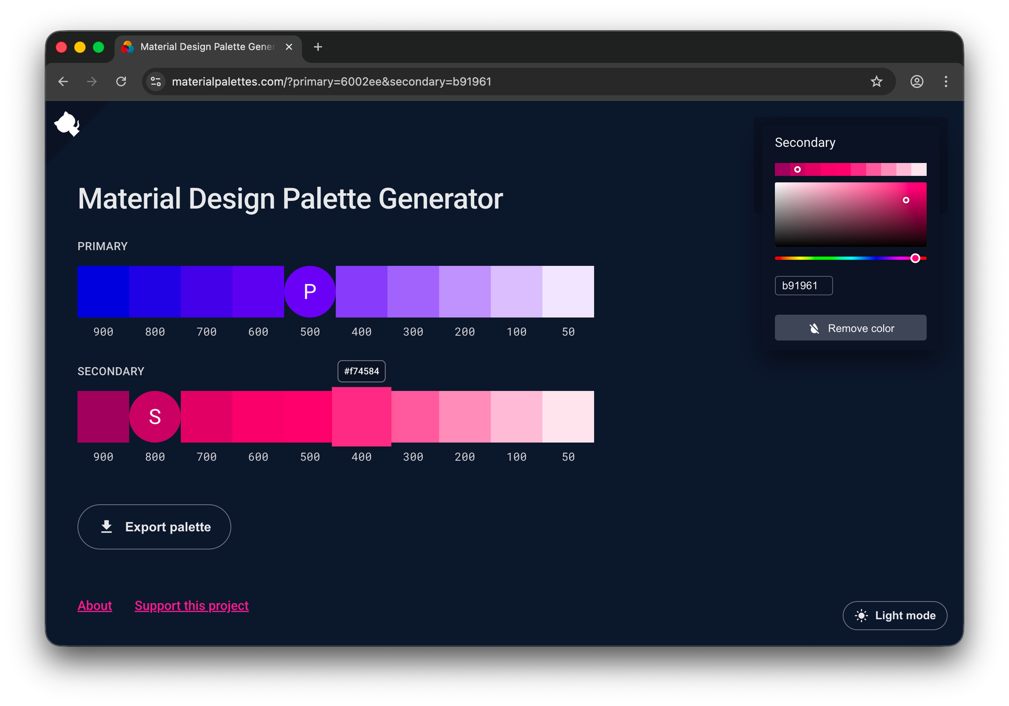 Material Palettes is an open-source color tool built on the Material Design color algorithm. While an official palette generator exists, it is buried deep within the documentation and poorly suited for repeated use. This project resolves that gap with a focused, standalone experience.